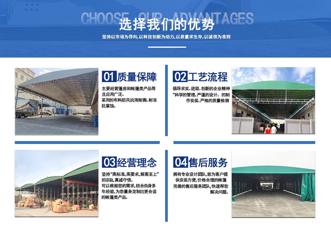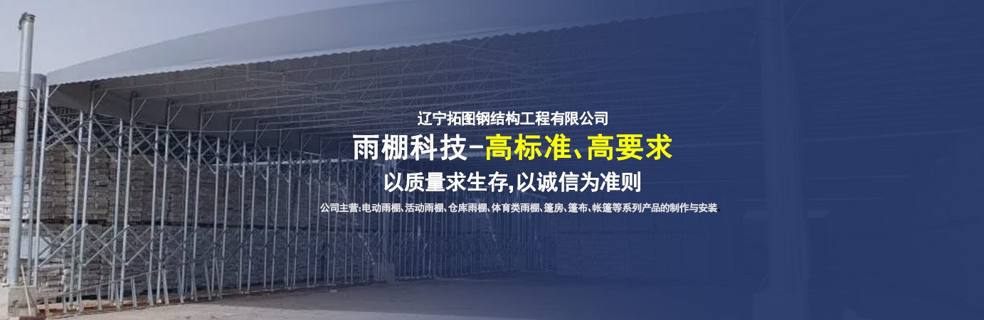 遼寧拓圖鋼結構工程有限公司是一家專業從事推拉篷設計、制作、安裝、使用、維修的綜合性公司。公司主營:電動雨棚、活動雨棚、倉庫雨棚、體育類雨棚、篷房、篷布、帳篷等系列產品的制作與安裝?! ?nbsp; 遼寧拓圖鋼結構工程有限公司堅持以市場為導向,以科技創新為動力,以質量求生存,以誠信為準則,倡導求實、進取、創新的企業精神?!翱茖W的管理、嚴謹的設計、 的制作安裝、嚴格的質量檢測、良好的后期服務成就企業的信譽,為您提供優質服務?! ?nbsp; 遼寧拓圖鋼結構工程有限公司傾力于開發應用三維空間結構與新材料的結合,將廣告藝術視覺表現形式與張力膜材科學的結合,推出多彩推拉蓬,依靠先進的科學技術,將推拉蓬建筑表現形式無限延伸,立志走在建筑科學的前沿,引導建筑時尚潮流,我們的目標是使推拉蓬建筑在中國發展壯大。 遼寧拓圖鋼結構工程有限公司憑著極強的事業熱情和豐富的專業經驗以“勤勉進取、銳意創新、至誠至信”的精神使公司得到迅速健康發展,業務范圍遍及全國。科學的管理、嚴謹的設計、高標準的制作安裝流程,嚴格把控產品質量,熱誠的售后服務是企業競爭力的源泉。 遼寧拓圖鋼結構工程有限公司人愿以最誠摯的態度,歡迎廣大客戶的蒞臨與溝通!愿為市場提供優...